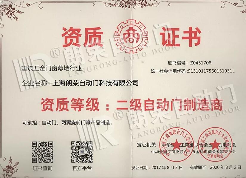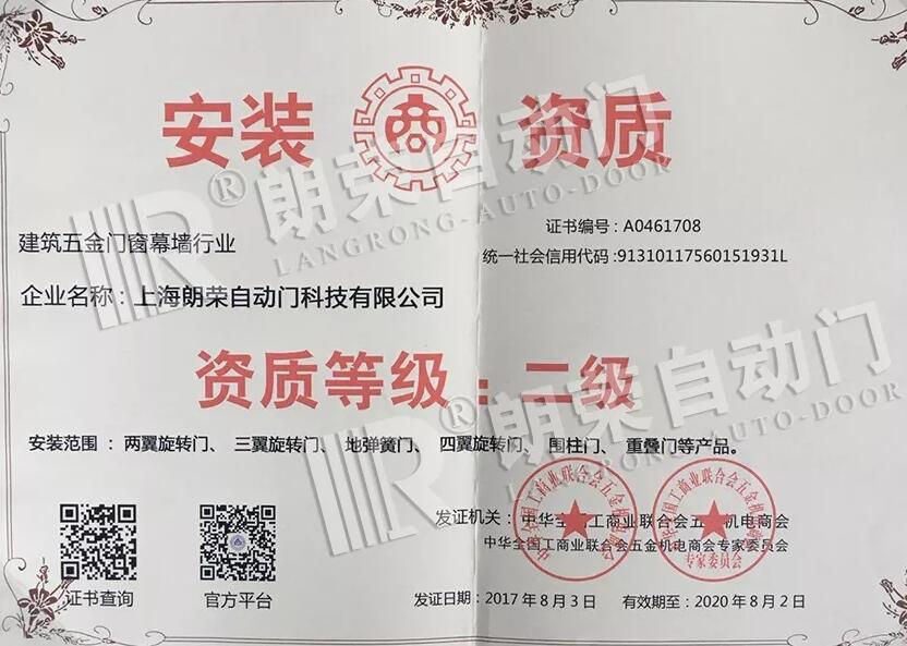 由于品牌化是朗榮發展必經之路,所以朗榮在鍛造自身實力的同時,也在持續完善朗榮企業資質,終于水到渠成,榮獲自動門制造資質和安裝資質,相信我們在今后會更加努力!